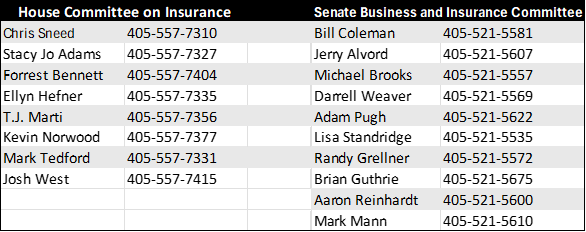 Oklahoma Watch reached out to every member of the Senate’s Business and Insurance committee and the House’s Committee on Insurance, a subcommittee of the Commerce and Economic Development Oversight committee, to ask if they had been contacted about proposed legislation.