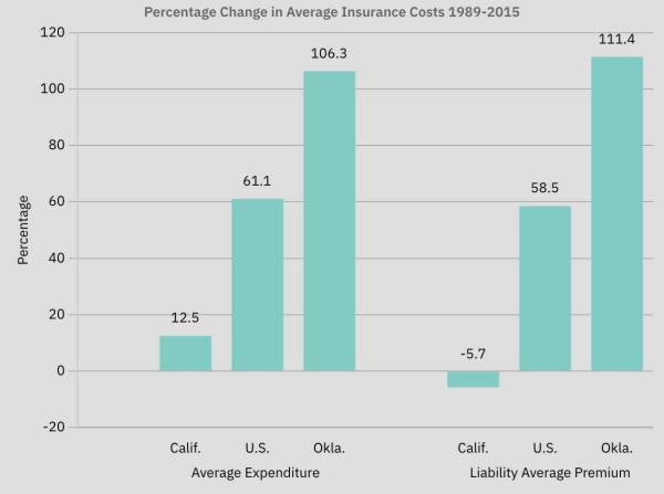 Average liability rates nationwide increased 58.5% from 1989 to 2015. California ranked first, enjoying a decrease in rates by 5.7%; Oklahoma ranked 44th, with rates climbing 111.4%.
